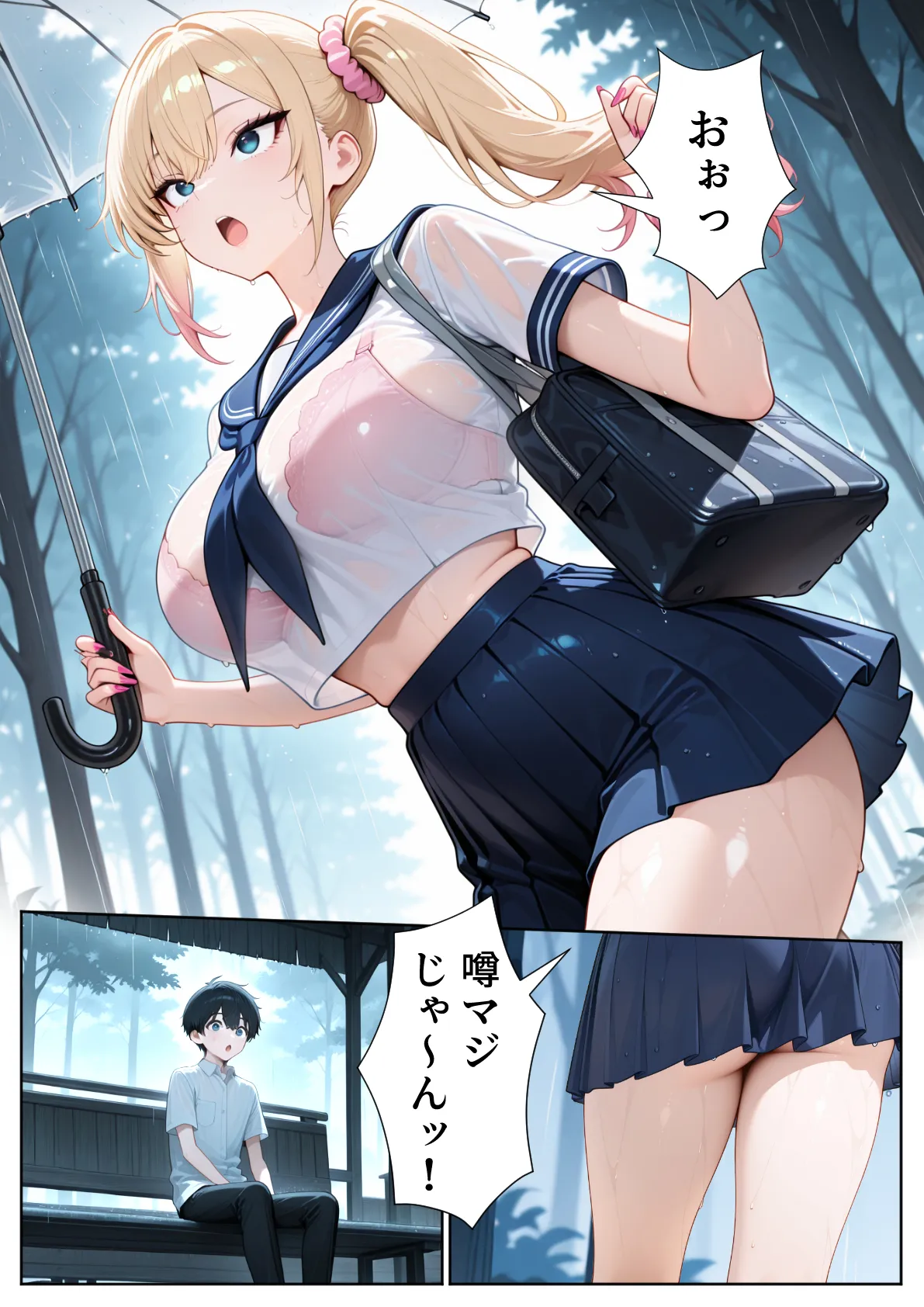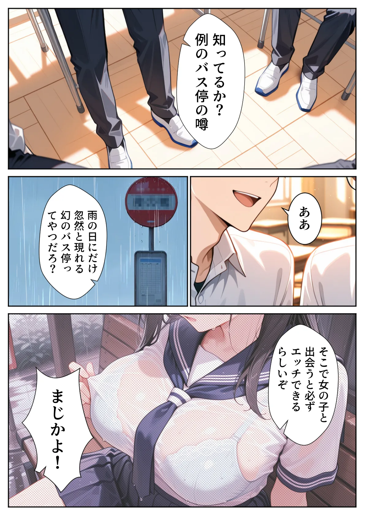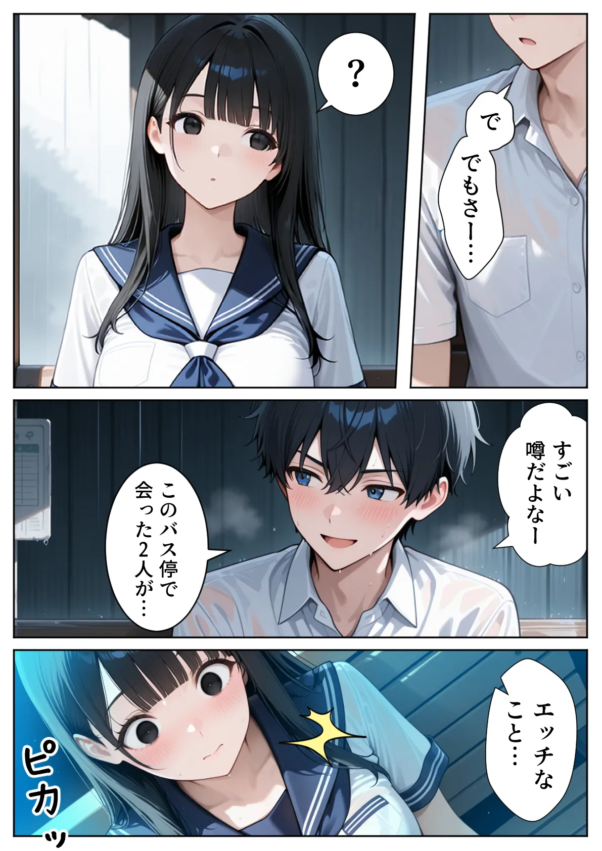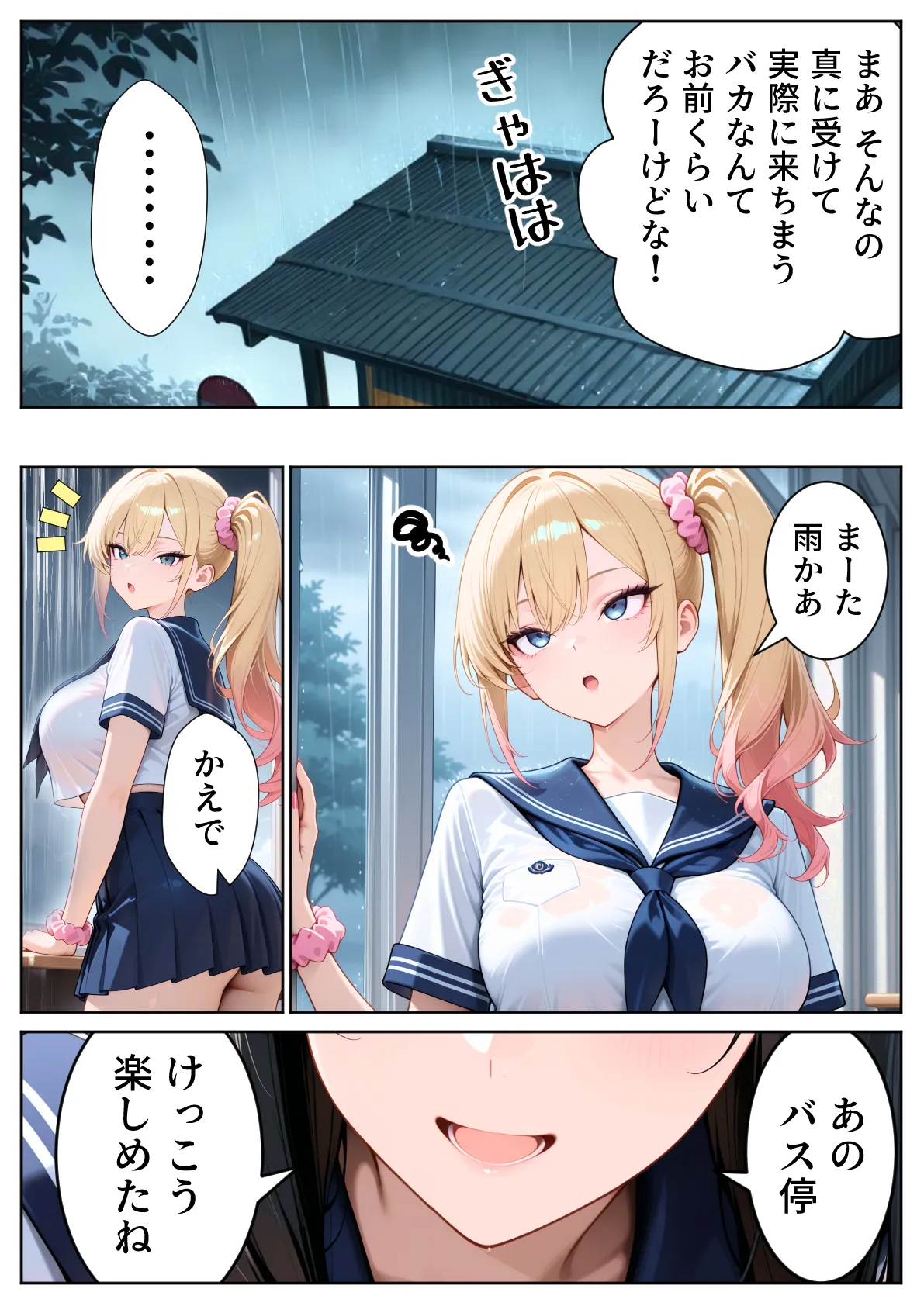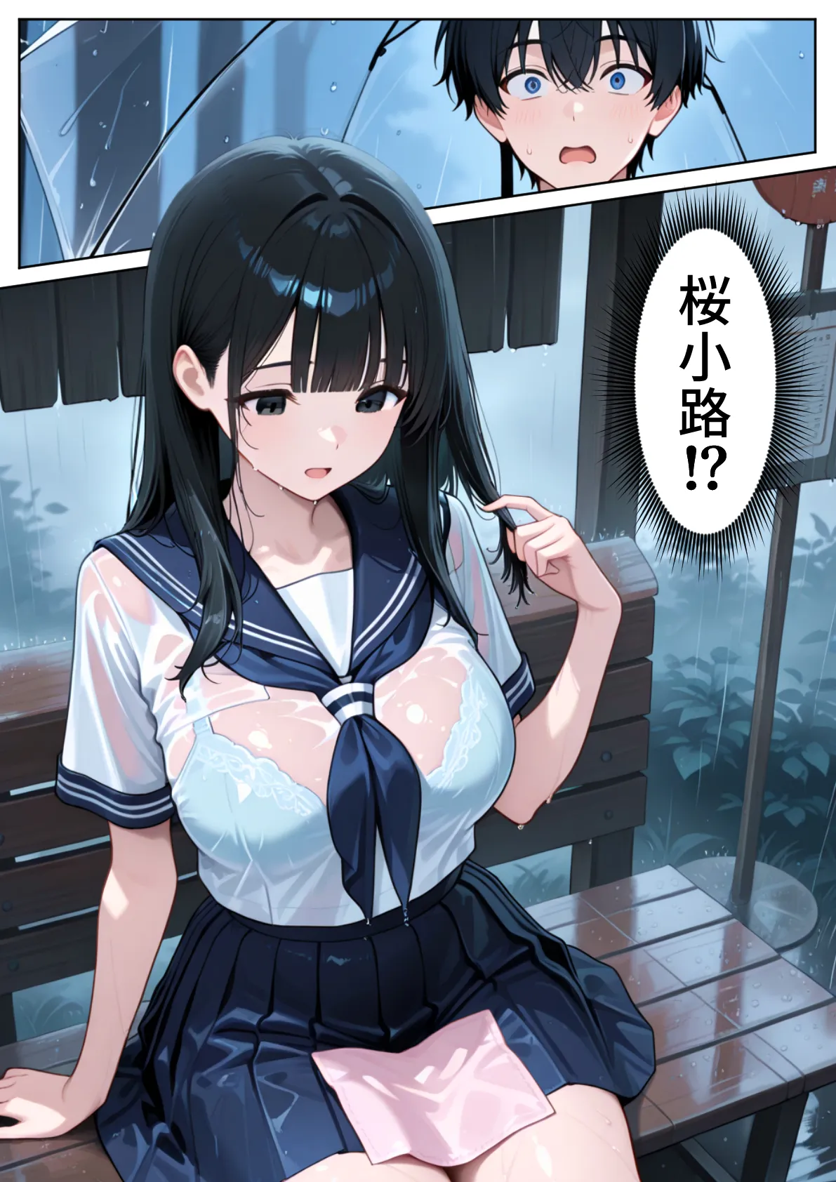 [ぱにぱに] 雨宿りのバス停で学園美女と濡れ透けSEXした話